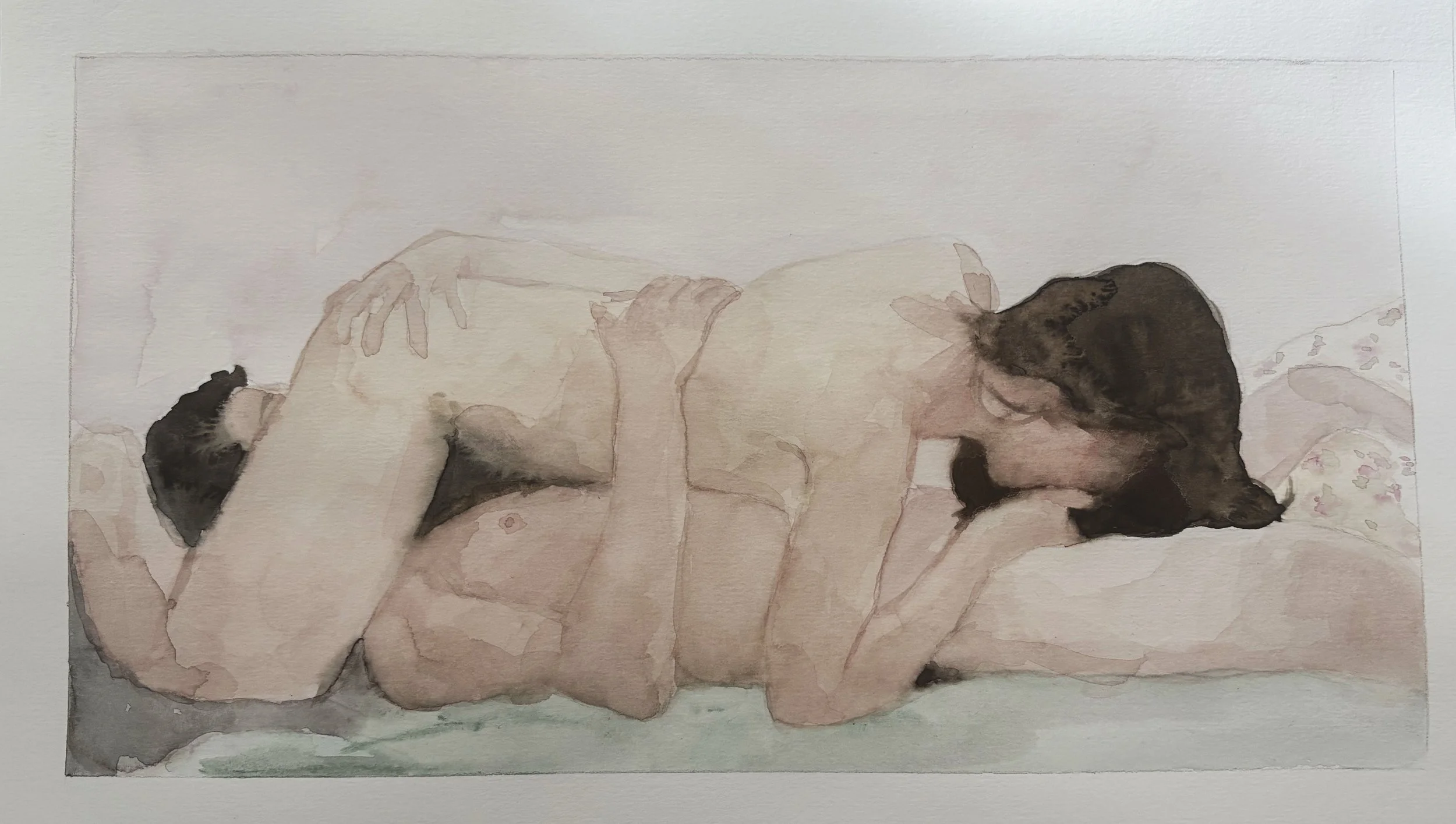 En la obra de Annie flores se expresa la íntima relación entre la transparencia y lo acuoso; lo húmedo y lo cristalino. La piel del papel que recibe el cuerpo de agua pigmentada. La mancha, protagoniza la indeterminación y aún así nace cuerpo, temperatura, olor y textura. El pigmento difuminado, disgregado, esparcido por la superficie y vuelto mancha, vuelto cuerpo, se impregna al papel, lo seduce, pero también se escapa, se vierte volátil, casi a punto de extinguirse. Los cuerpos se presentan como paisajes; huellas de miradas ajenas, que en un parpadeo, lo que se contiene se desborda, como quien acecha, quien mira a la espera de algo.